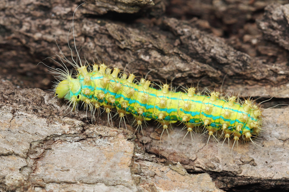 入夏后,有的樟树上出现了一些“大虫”,它们衣着华丽,体型巨大如成人的中指,体表布满钝刺和长毛,一副不可冒犯的样子,这就是樟蚕。樟蚕是属于鳞翅目大蚕蛾科的一种野生吐丝昆虫,其丝可用于制作成伤口缝线和优质钓鱼丝,幼虫主要危害樟树、枫树等林木。樟蚕是一种“长寿”的蚕,幼虫生长期长达70多天,蜕8次皮。7月化蛹后直到第二年的3月才羽化,时间长达8个月。看它色彩艳丽而又满身钝刺的样子,接触后会让人皮肤过敏吗?啊哈!不会的,它的钝刺没有分泌毒液的功能,是用来吓唬人的,你可以放心的在手上把玩,它在手上爬动的感觉好刺激喔!