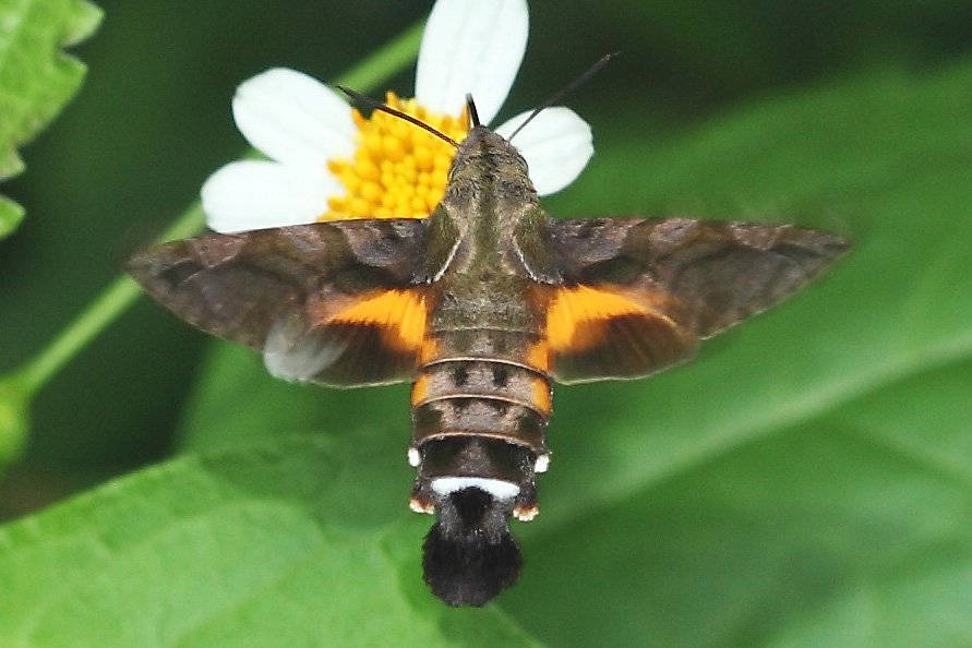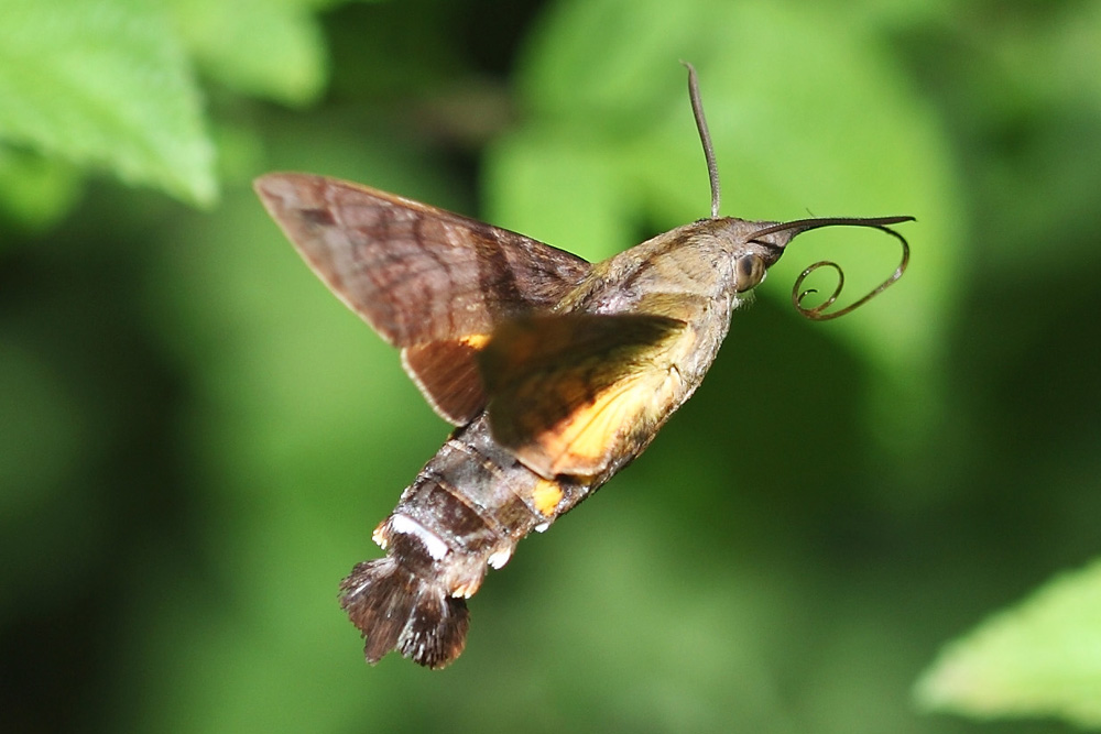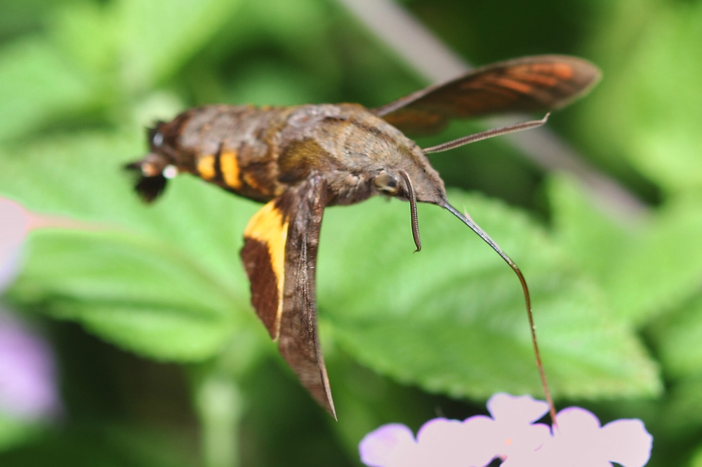 如果你在附近的花丛中惊喜的看到了蜂鸟,那要打击你一下,错了!其实是它很可能是天蛾科长喙天蛾属的一个物种——黑长喙天蛾。这类天蛾身形优美艳丽,体长约3-4厘米,喙长超过体长,能像直升机一样在花前悬停吸食花蜜。能让人误认为它是蜂鸟的原因就是因为它像极了蜂鸟!