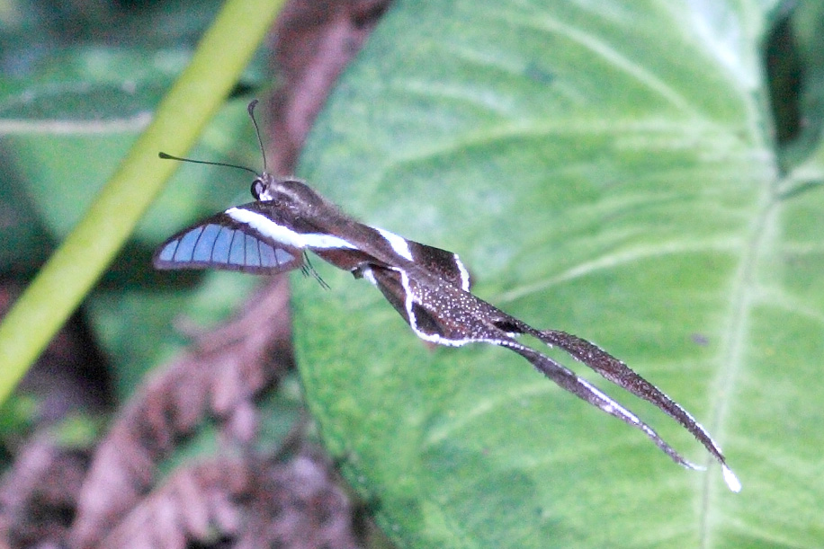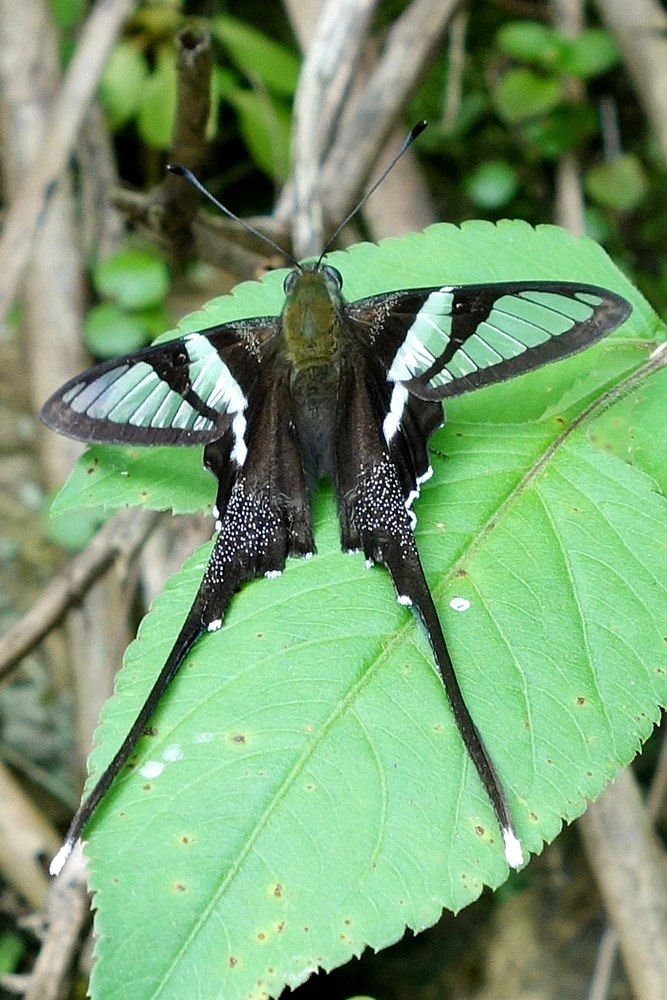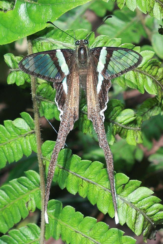 绿带燕凤蝶生活在林间沼泽地带,翅膀有部分透明,两翅各有一条绿带,因此得名。它的前翅不大,但后翅极长,形成长长的尾突,看起来就像是燕子的尾羽一样,燕凤蝶的中文名字也因此而来。绿带燕凤蝶展翅飞翔时显得非常飘逸,衣袂飘飘,仙气十足,好似踏花而来的林中仙子。虽然受到尾突的拖累,但丝毫不影响其具有的飞翔特技,疾飞、倒飞,甚至悬停飞行都样样娴熟,不仔细观察还易被误认为是蜻蜓。绿带燕凤蝶为蝶类的珍稀物种,已被国家列入“三有保护动物名录”。雄性绿带燕凤蝶有个不文明的习惯,就是在水边一边喝水一边“撒尿”,几乎隔几秒就撒一次,这可能是在滤食水中的矿物质或散热。绿带燕凤蝶也许不是体型最小的凤蝶,但一定是最仙的凤蝶。