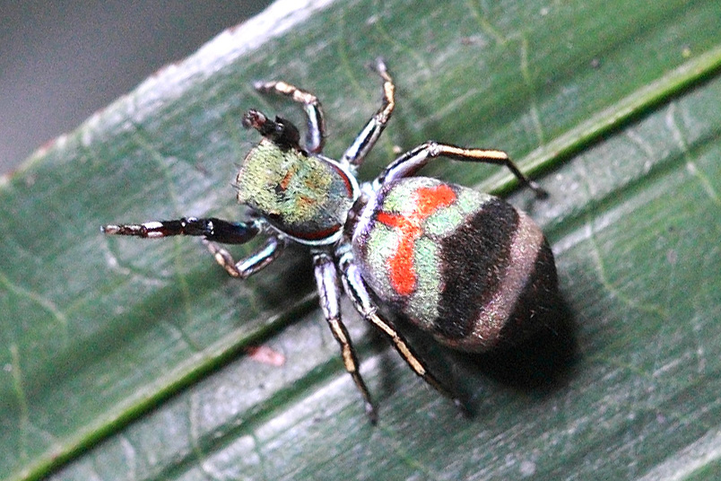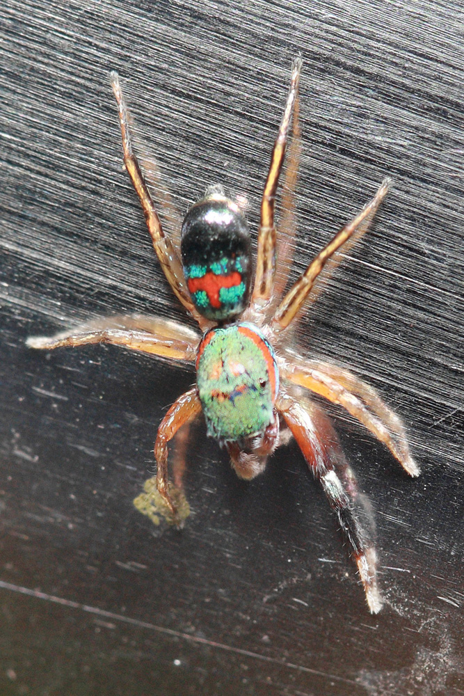 蓝翠蛛是一种奇特的跳珠,虽不善于跳跃,但爬行速度还是很快的,在运动时,还不时举起值得骄傲的腹部,亮出色彩斑斓的斑纹,告诉你它是跳蛛界最靓的“靓仔”。蓝翠蛛身体呈黑色,背面有蓝、绿、黑、红和白色斑纹,色彩纯粹而又饱含光泽,十分亮眼。玉翠蛛这种独特的颜色并非色素显色,而是一种通过独特结构的毛和鳞片来反射、折射光线,最终成为翠玉般的色彩的。蓝翠蛛是游猎性蜘蛛,也是一个机会主义者,特喜欢捕食蚂蚁。它经常潜伏在蚂蚁大队的路旁,伺机而动。当蚁群中有人落单或单独行动时,就立即扑上去,先用毒刺蛰伤后,后用蛛丝把猎物五花大绑起来,拖到僻静处享用。