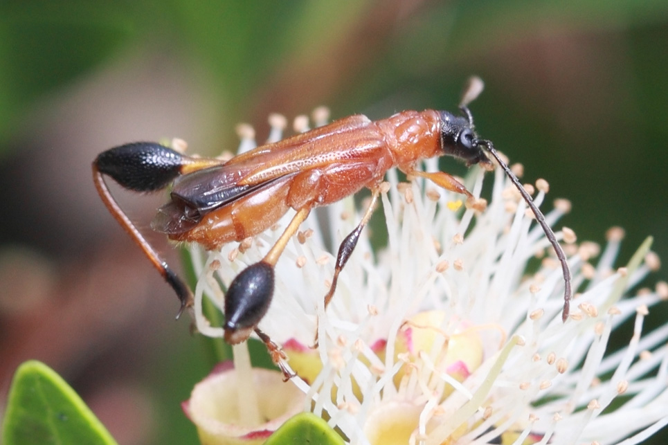 提到天牛,人们就会想到它的形象是这样的:长长的触角,壮硕的身躯,牙齿巨大而锋利,一副森林混混的形象。而乌来粗腿短翅天牛走的却是萝莉路线,它身材娇小,体长只有约1厘米,成虫也不想其他天牛那样吃树叶、嚼木头,而是品花吸蜜,一副小资形象。最奇特的是它的后腿,腿节后端膨大,像个黑色的棒槌,至今人们不知道它这棒槌是用来干嘛的