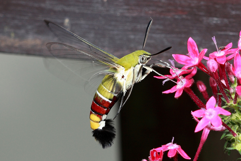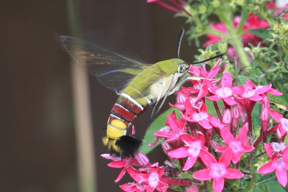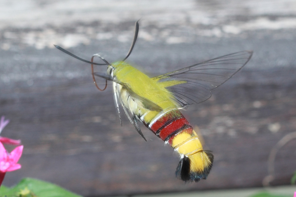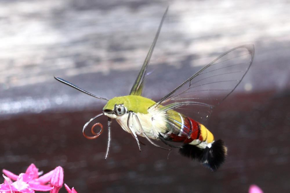 ,咖啡透翅就是常见的种类。咖啡透翅天蛾翅膀淡黄色透明,这是名为“透翅”的原因,但初羽化时它的翅上还是有鳞片覆盖的,随着它的生长,翅上的鳞毛会脱掉,成为透明的翅。咖啡透翅天蛾胸部背面覆盖黄绿色的绒毛,很像鸟类的羽毛。腹部有红色、黑色的横斑,末端呈扇形展开,非常漂亮!咖啡透翅天蛾被误认为蜂鸟,是因为它的形体和飞行姿态像极了蜂鸟。飞行时它的翅膀振动频率很高,每秒可达25到30次,发出清晰的嗡嗡声,它时而快速飞掠,时而在花朵前稳定悬停,前进后退自如,还不时伸出长长的喙管吸食花蜜,这完全是蜂鸟的给人留下的印象,让人们来一场“美丽的误会”也就不足为奇了。