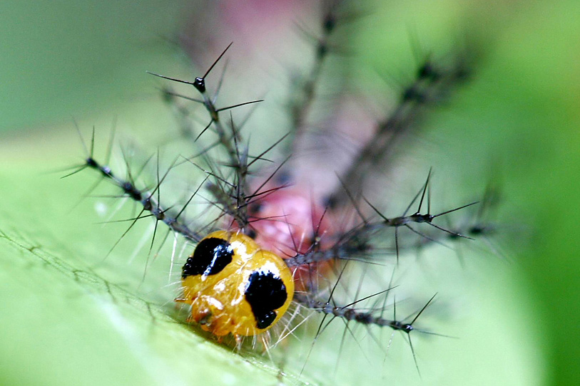 黄襟蛱蝶的看点是它的娃,这娃长相非常奇特,全身长满长刺,每支刺上还有分枝伸出的尖刺,一副不可冒犯的样子。最萌的是它身披一袭紫衣,黄色小脑袋上一抹红唇