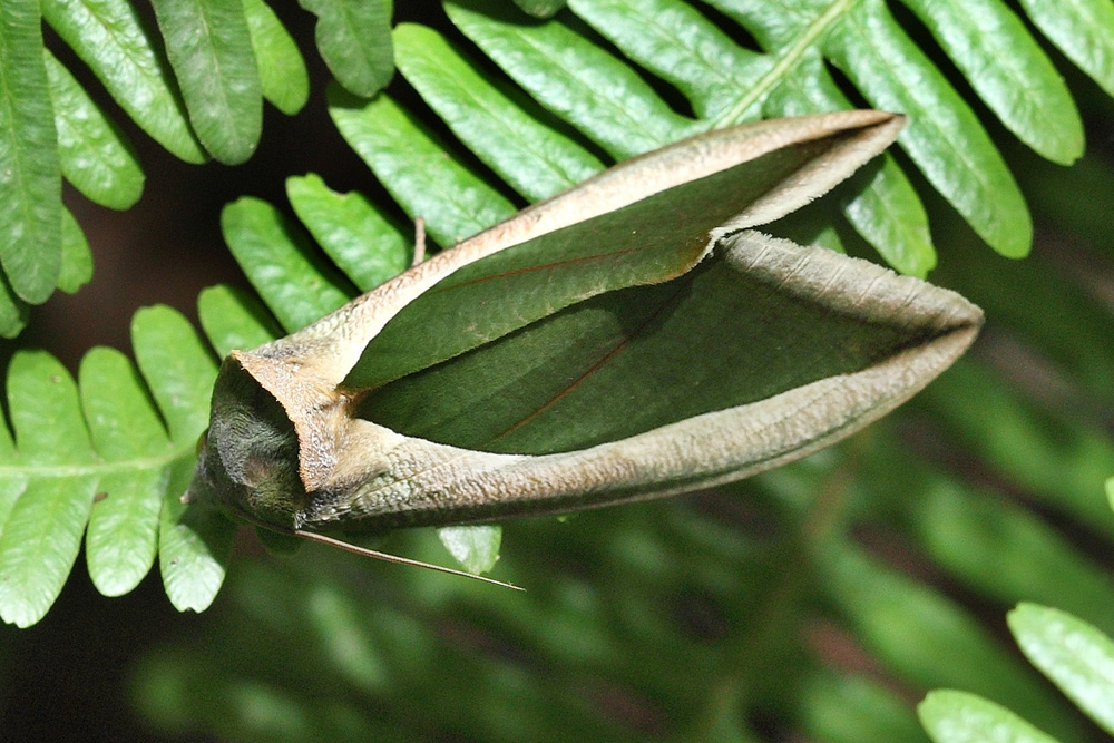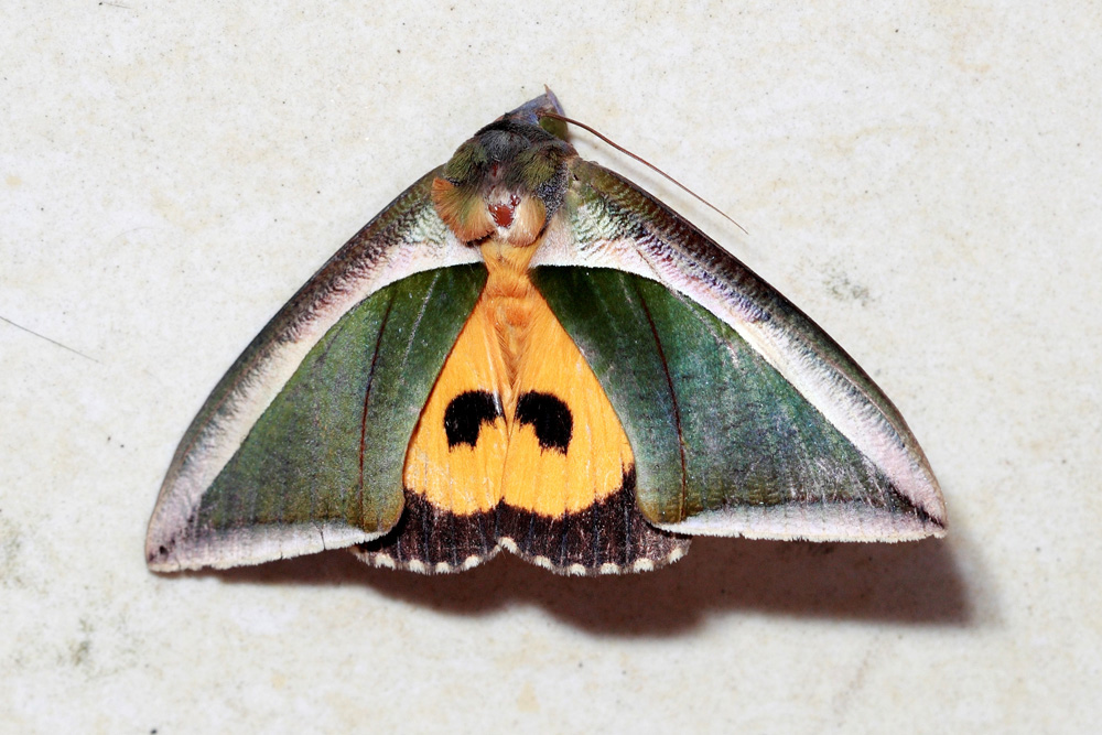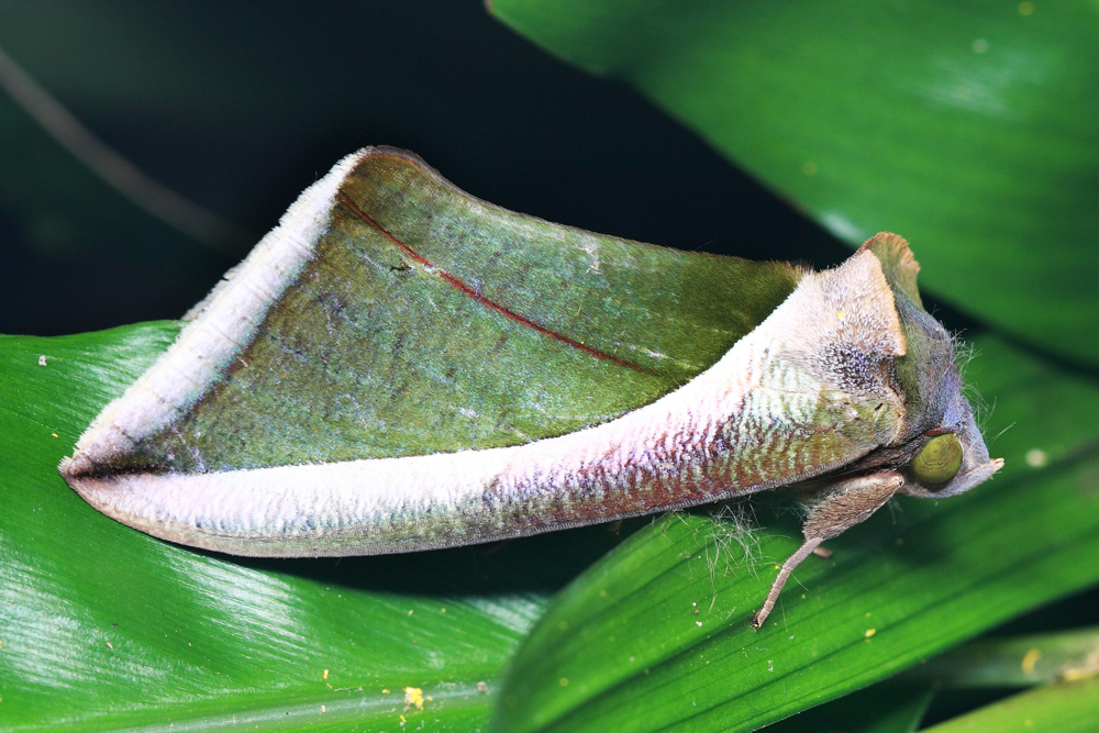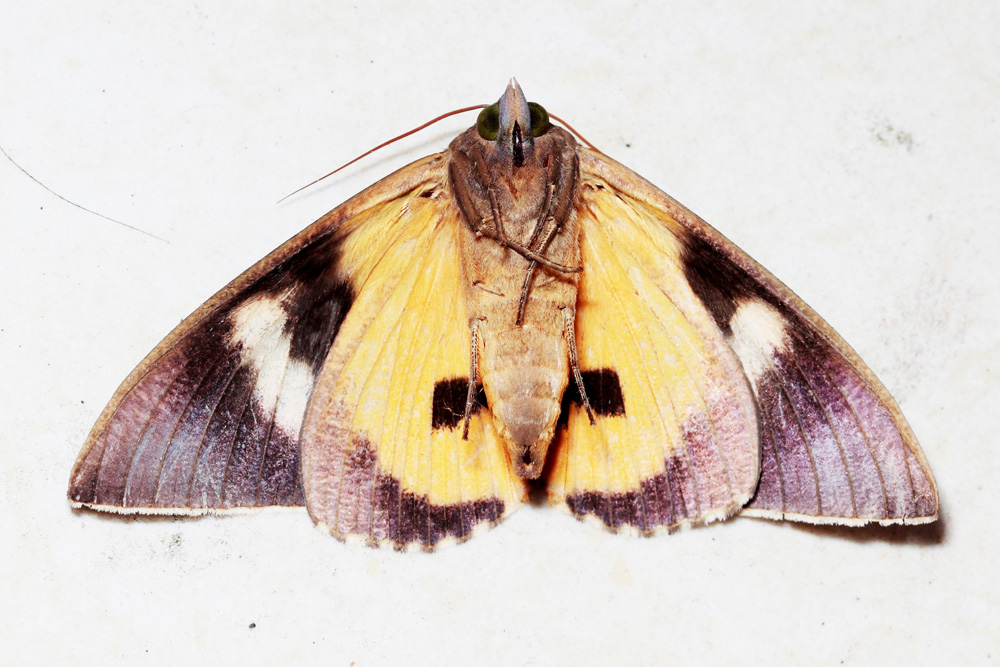 我们不得不敬佩自然选择的精妙,也感叹原来虫子也这么“卷”!想想连虫子都这么卷,你还有什么可抱怨的!当艳叶夜蛾展翅后,就像一只平常的蛾子,但后翅上两只黑色眼点还是真能吓跑不少觊觎者。艳叶夜蛾的喙像只钢针,端部坚硬锐利,且有倒刺,能直接刺穿果皮吸食果实汁液,它的成虫的确是靠吸食果实汁液为生的,这对果农来说可不是个好消息。