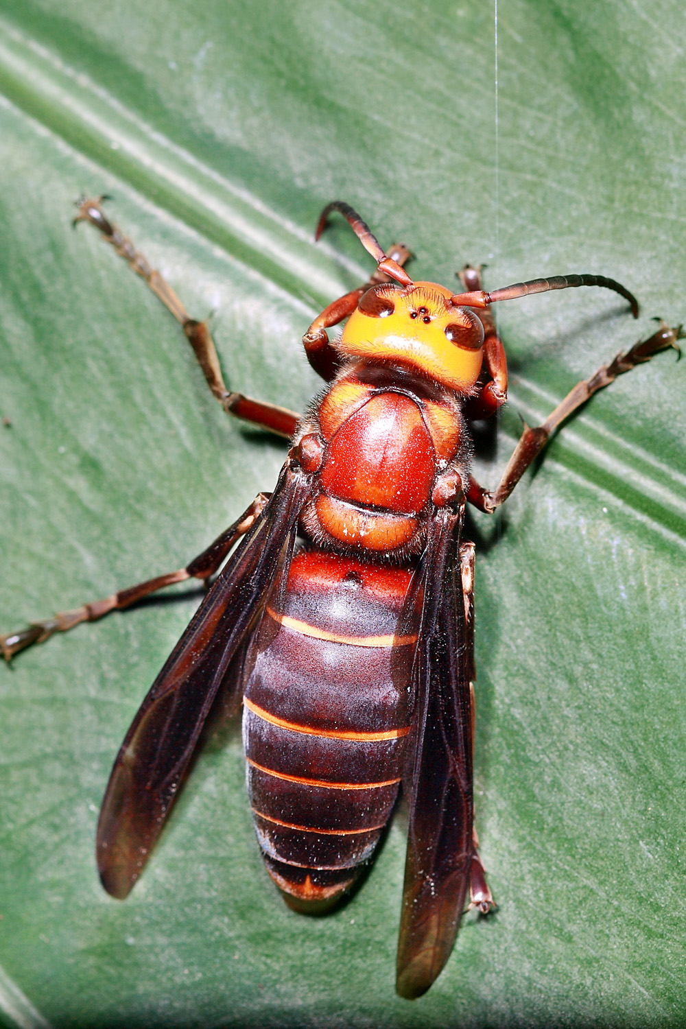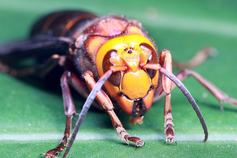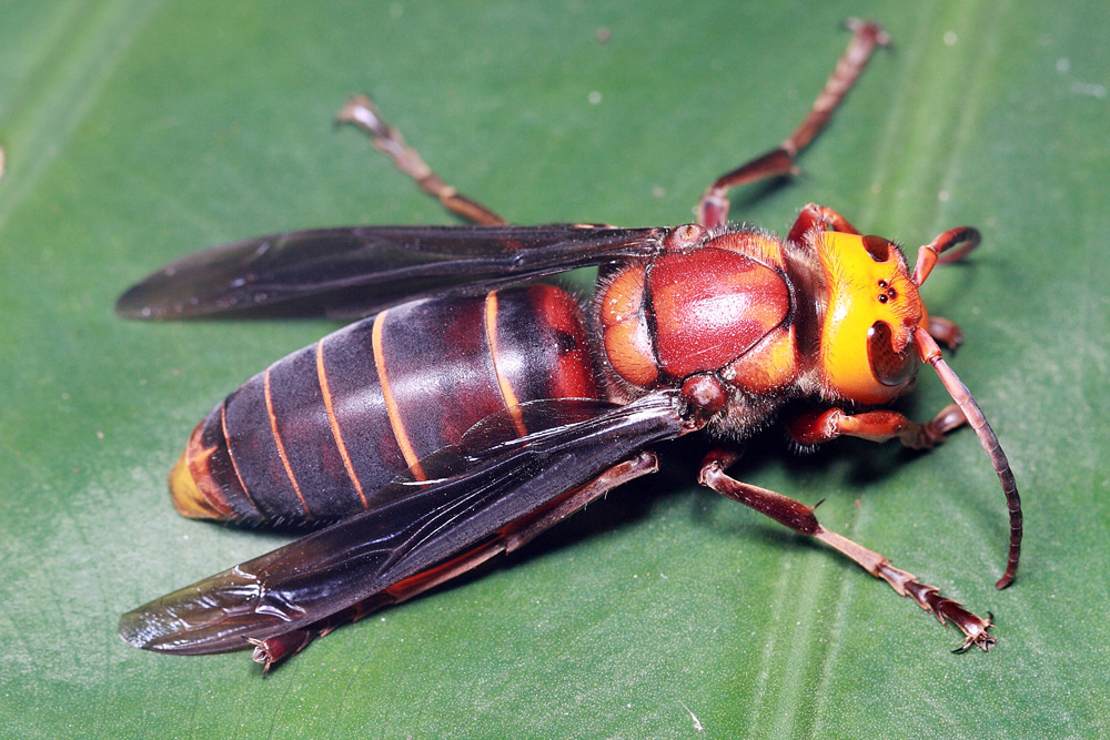 中华大虎头蜂又名金环胡蜂,它身体壮硕,体长可以达到4-5厘米,与成人小手指大小相当,是世界上体型最大的胡蜂,不接受“之一”!如果仅仅是体型比较大,倒也没什么可惊慌的,毕竟比它大的多的昆虫不在少数,然而最关键的是,金环胡蜂是世界上毒性最强的胡蜂,他们所分泌的毒素为混合毒素,其成分包含组胺类、溶血类及神经类毒素,其中组胺类毒素可导致过敏性休克,进而可能导致肝肾衰竭,对过敏性体质的人而言尤为危险。由于金环胡蜂体型巨大,因此他一次性分泌的毒素剂量很大,可以达到普通胡蜂的2-3倍,且他的鳌针长度居然可以达到6毫米,试想一下,一根针扎入皮肤6毫米,会是什么样的感受,再加上毒素的作用,相信会让人终生难以忘怀!然而金环胡蜂对待其他蜜蜂,则变身为了疯狂的掠夺者,为了自己的生存,它们经常会大开杀戒,