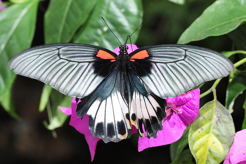 美凤蝶又名大凤蝶,是一种雌、雄异型的大型蝴蝶,翅展有105—130毫米。雄蝶全身和翅呈蓝黑色,翅的反面有几处红斑,显得非常华贵。它的后翅反面基部有数个月形大红斑,飞翔时不停地闪现,显得风采翩翩。雌蝶双翅颜色较浅,前翅基部有两片红斑,显得端庄而素雅。美凤蝶是南方常见蝶种,在野外活动时,总是成双成对的飞行,雌、雄两蝶上下翩舞,一只深蓝一只浅白,形影相随。凤蝶的美被赋予了许多的传说,戏曲《梁山伯与祝英台》中梁祝为爱情化为的蝴蝶,可能就是美凤蝶,广东、云南等地民间称之为“梁祝凤蝶”。